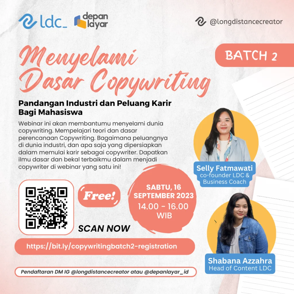 Webinar ini akan membantumu menyelami dunia copywriting. Mempelajari teori dan dasar perencanaan Copywriting, bagaimana peluangnya di dunia industri, dan apa saja yang dipersiapkan dalam memulai karir sebagai copywriter.