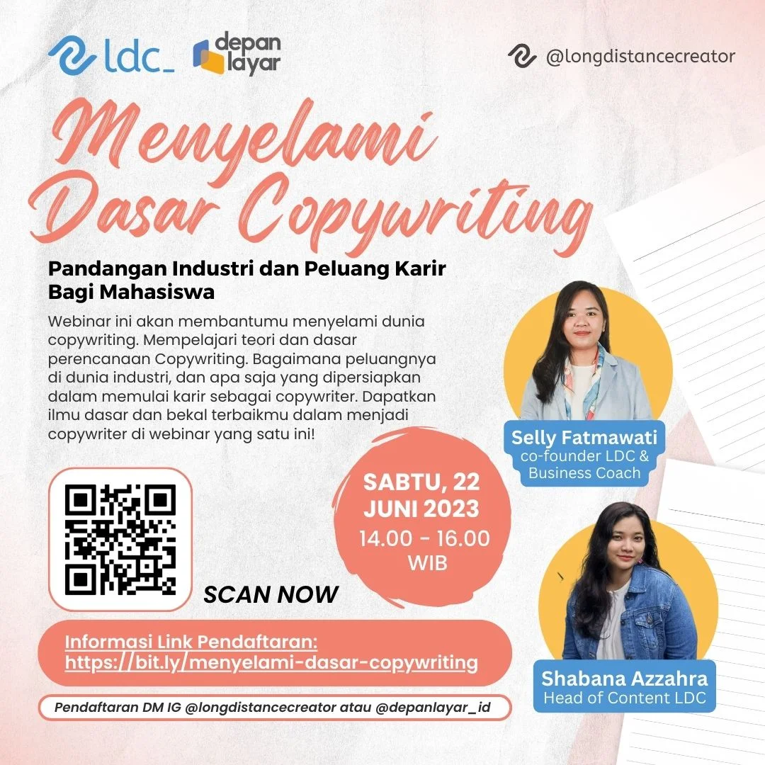 Webinar ini akan membantumu menyelami dunia copywriting. Mempelajari teori dan dasar perencanaan Copywriting, bagaimana peluangnya di dunia industri, dan apa saja yang dipersiapkan dalam memulai karir sebagai copywriter.